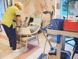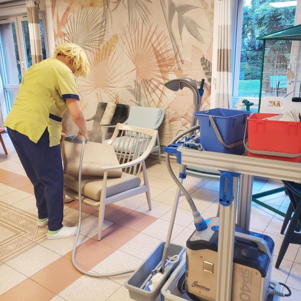 99.99 % des bactéries et virus sont éliminés après un passage à la vapeur. Nous avons donc décidé de développer ce moyen de désinfection. Ici, le nettoyage des fauteuils et chaises du salon d'animation.