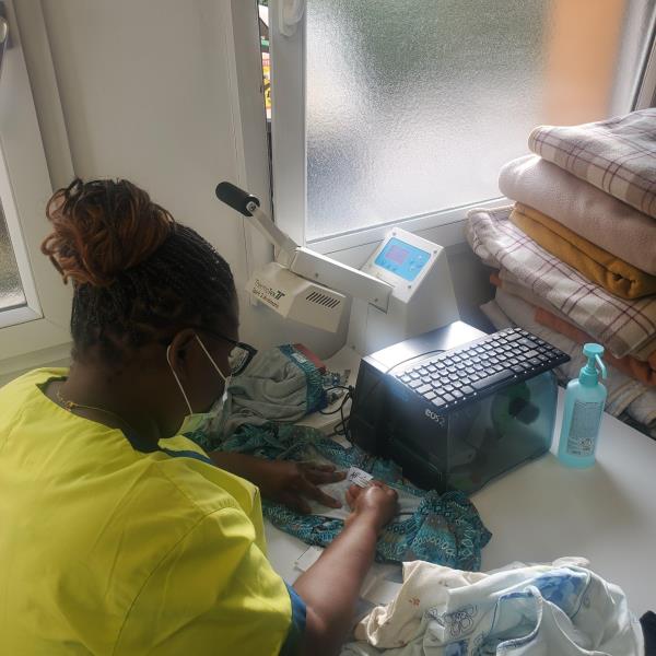 Béatrice met régulièrement à jour les étiquettes lorsqu'un vêtement est remplacé, un marquage s'efface ou qu'un vêtement non identifié est retrouvé en chambre. Ce suivi évite les pertes, les échanges et les retards dans la restitution du linge.