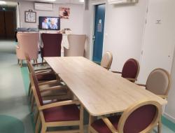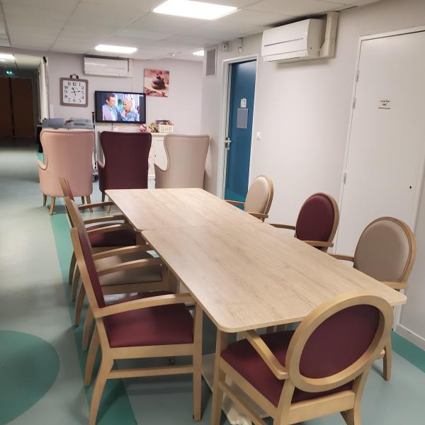Nous avons reçu cette semaine le nouveau mobilier de l’unité protégée. Les tables rondes et chaises multicolores ont été remplacées par 2 tables rectangulaires et de jolies chaises beiges et bordeaux qui rappellent les couleurs des fauteuils existants. Les tables rectangles permettent de dresser une grande table où tous les résidents se retrouvent lors du repas pour un moment de convivialité
