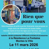 Publiée le 10/03/2026Nos résidents ne peuvent pas tous se rendre dans les boutiques pour acheter de nouveaux vêtements.. C'est pourquoi, nous faisons appel tous les deux/trois mois à une vendeuse ambulante, qui se déplace avec son véhicule et expose au sein de la résidence. Ce mercredi 11 Mars, de 14h30 à 17h, nous accueille [...] Lire la suite