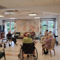 Publiée le 27/02/2026Aujourd'hui, notre kinésithérapeute est absente et la séance de gymnastique annulée de ce fait.... Nos résidentes en ont décidé autrement !! Madame T. a mené la séance avec brio ! BRAVO MESDAMES !! Lire la suite