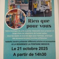 Publiée le 20/10/2025Les 21 et 24 octobre, nous accueillerons des boutiques spécialisées dans la vente de vêtements pour séniors au sein de la résidence. Nathalie Leopold, animatrice, se tient à votre disposition pour tout renseignement complémentaire Lire la suite