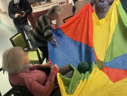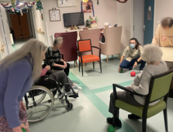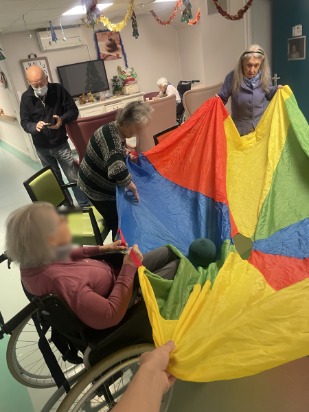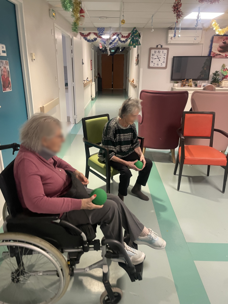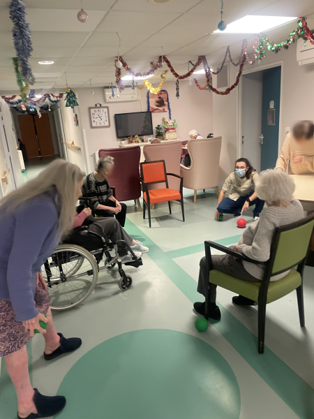 Vendredi 9 Janvier, les rééducateurs ont animé un atelier parachute et pétanque adapté dans l'unité de vie protégée.