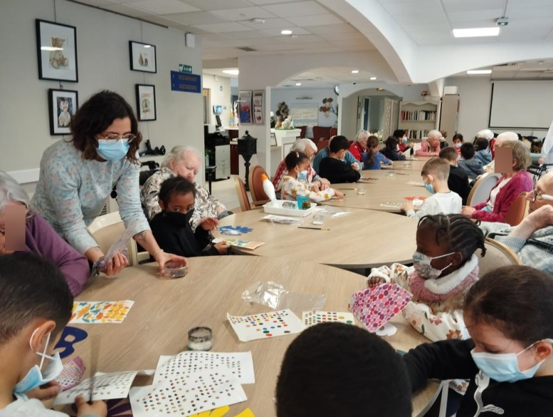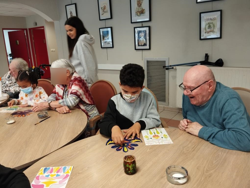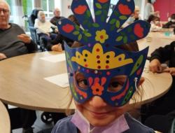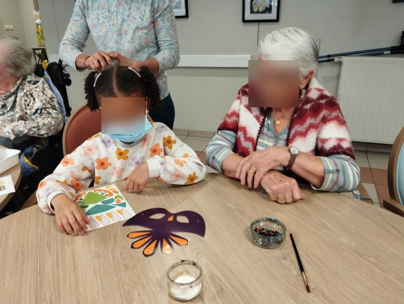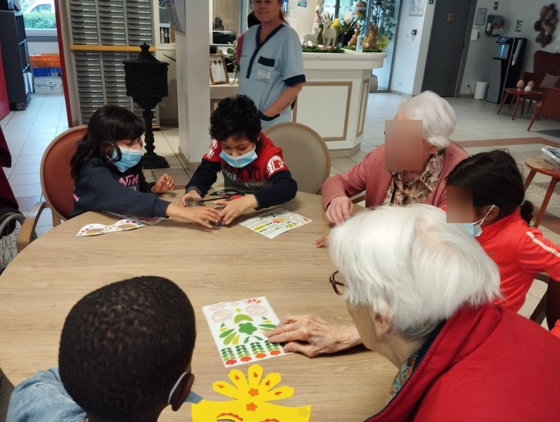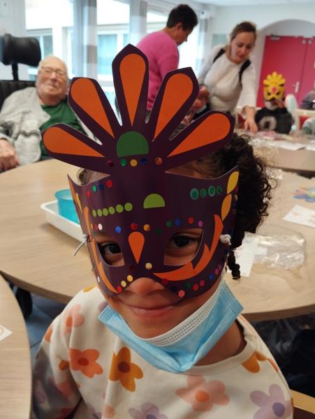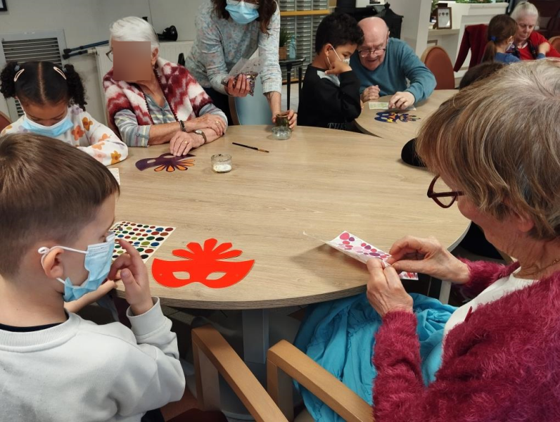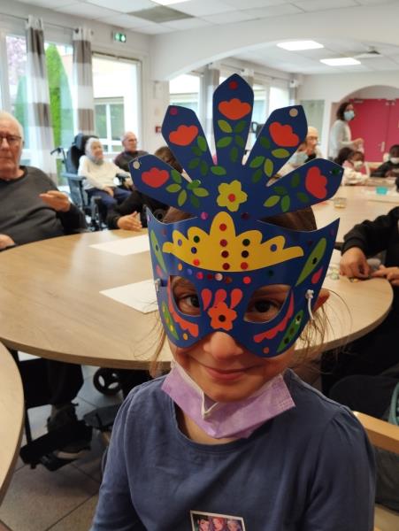 Vendredi dernier, en compagnie des élèves de l'école des Merisiers, nous avons confectionné des masques de carnaval, les résidents comme les enfants apprécient ces moments d'échanges.