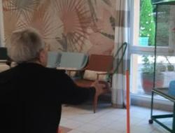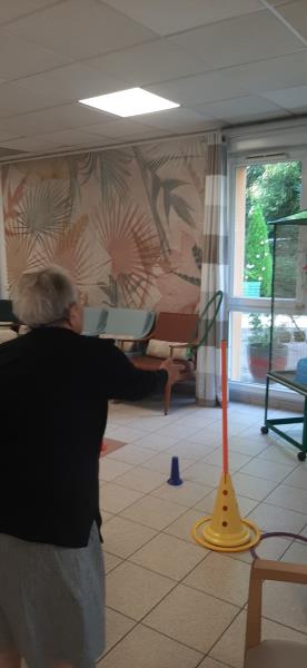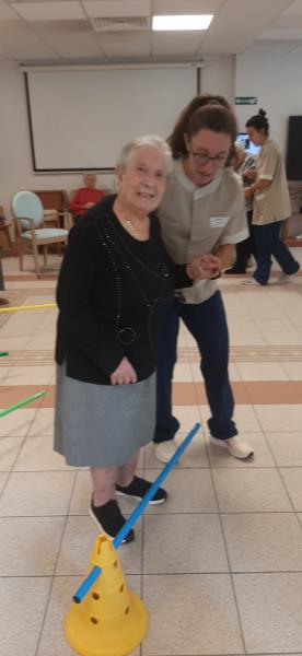 Eva, notre ergothérapeute, accompagne nos résidents sur des ateliers d'équilibre. Des grands progrès sont notables auprès de nos résidents