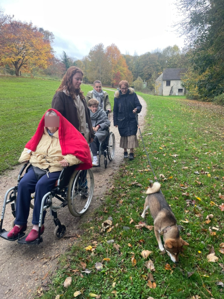 Dans le cadre de la rééducation, notre kiné organise régulièrement des sorties au parc avec nos résidents. Aujourd'hui, TANGO, son chien, l'a accompagnée toute la journée pour le plus grand plaisir de nos résidents !